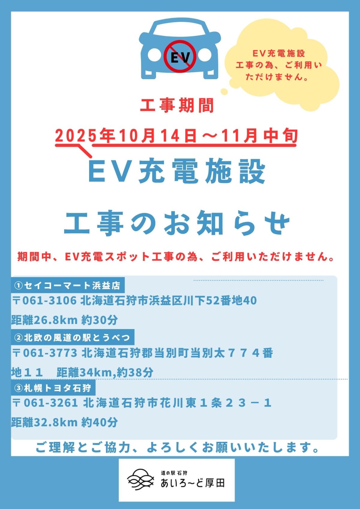 本別道の駅に設置してあるEV充電入れ替え工事のお知らせ 2025.9.26