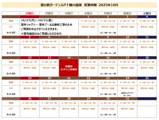 施設メンテナンスによる「休館日」のお知らせ 2025.10.2