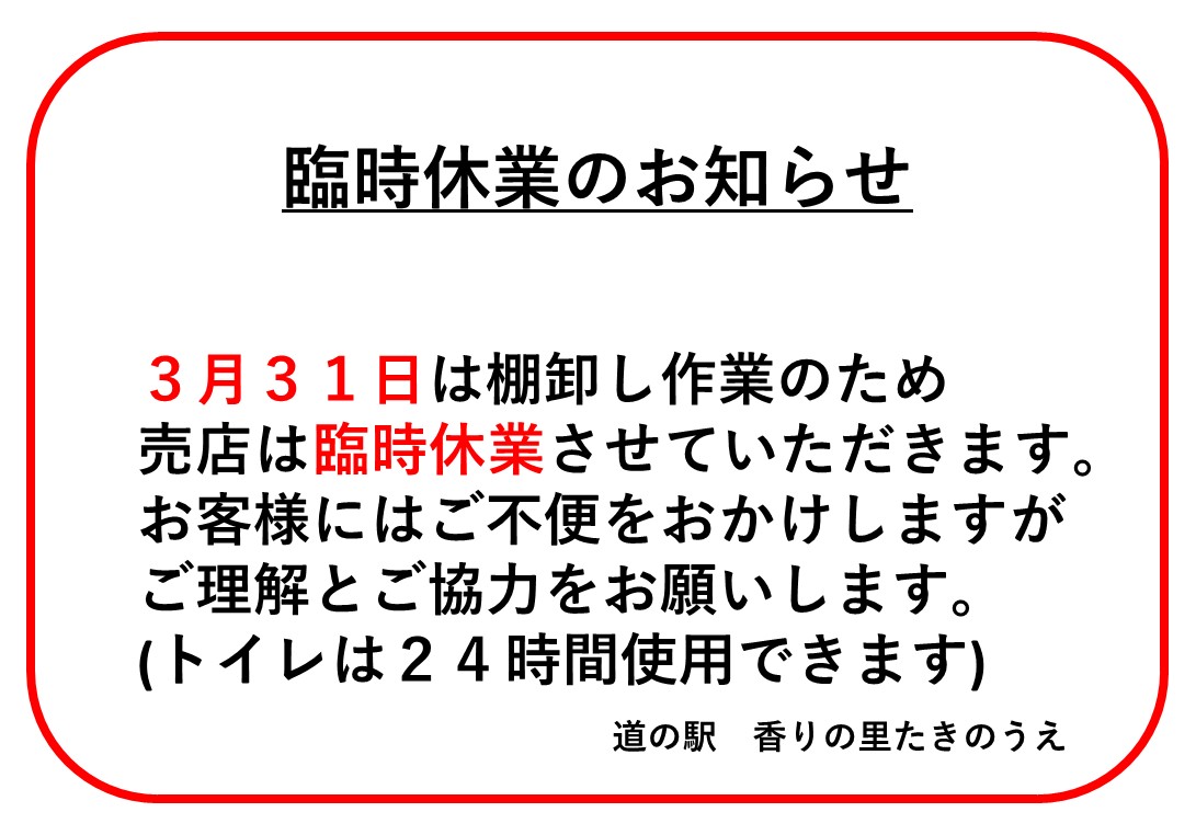 道の駅「香りの里たきのうえ」臨時休業のお知らせ 2026.3.19