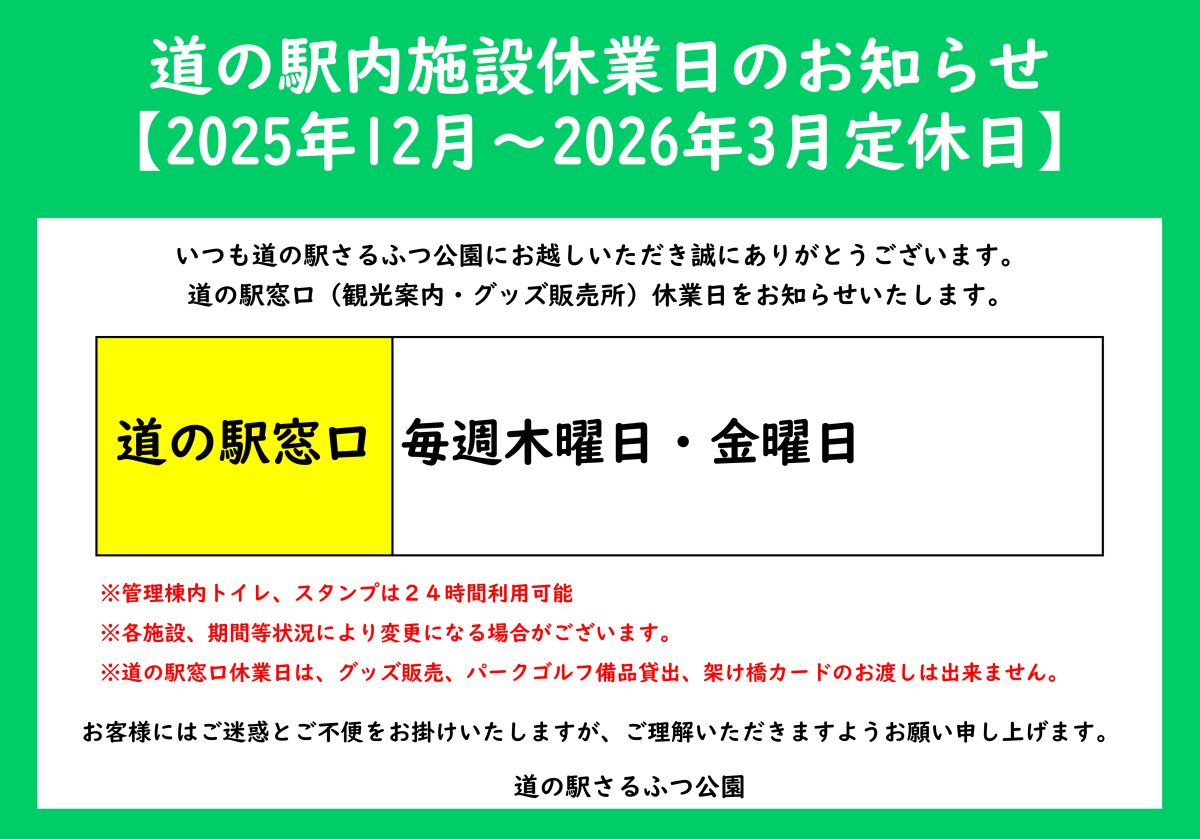 道の駅内施設 定休日のお知らせ(12月~3月) 2025.11.19