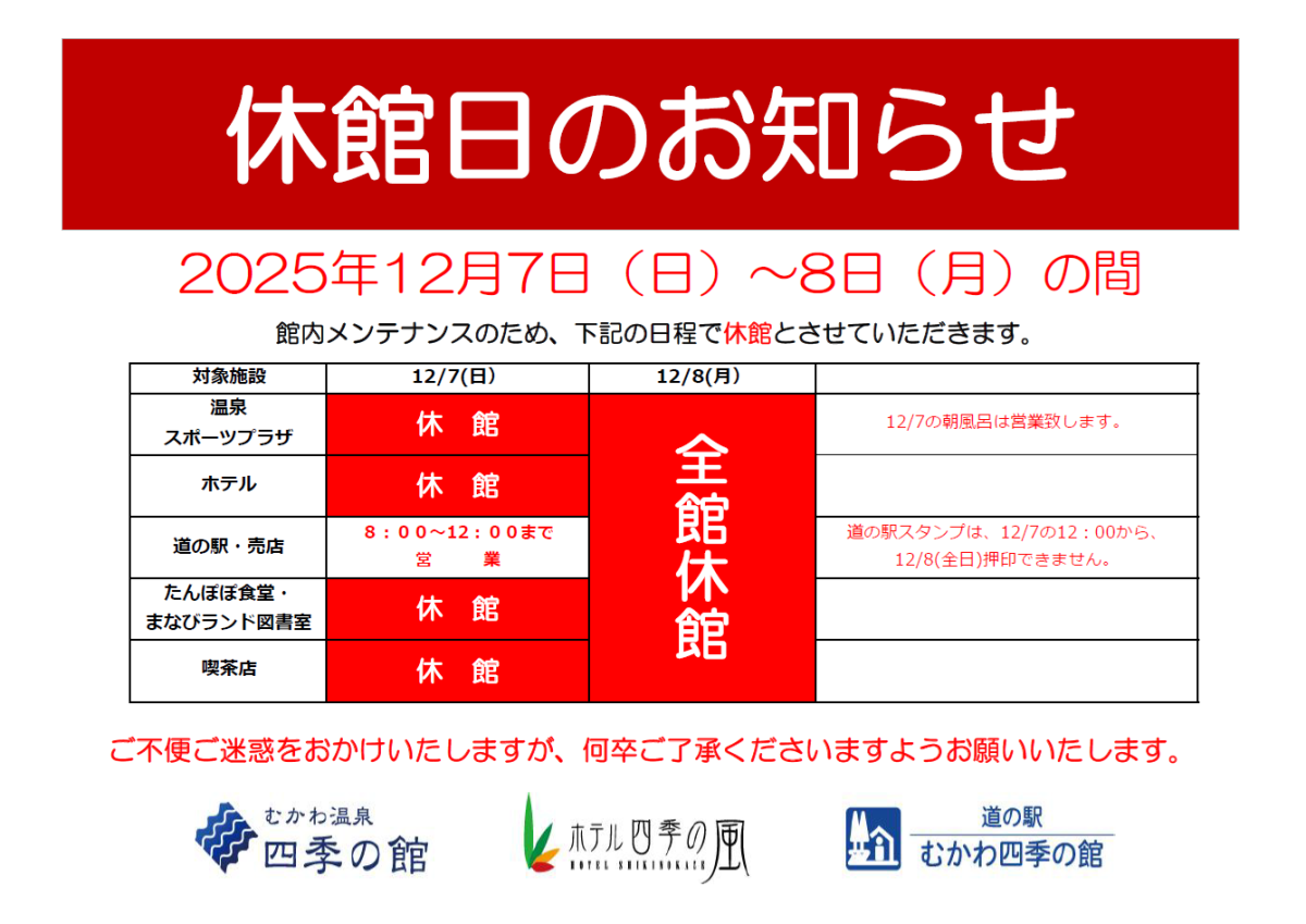 【重要なお知らせ】令和7年11月1日(土) 臨時休館について 2025.10.31