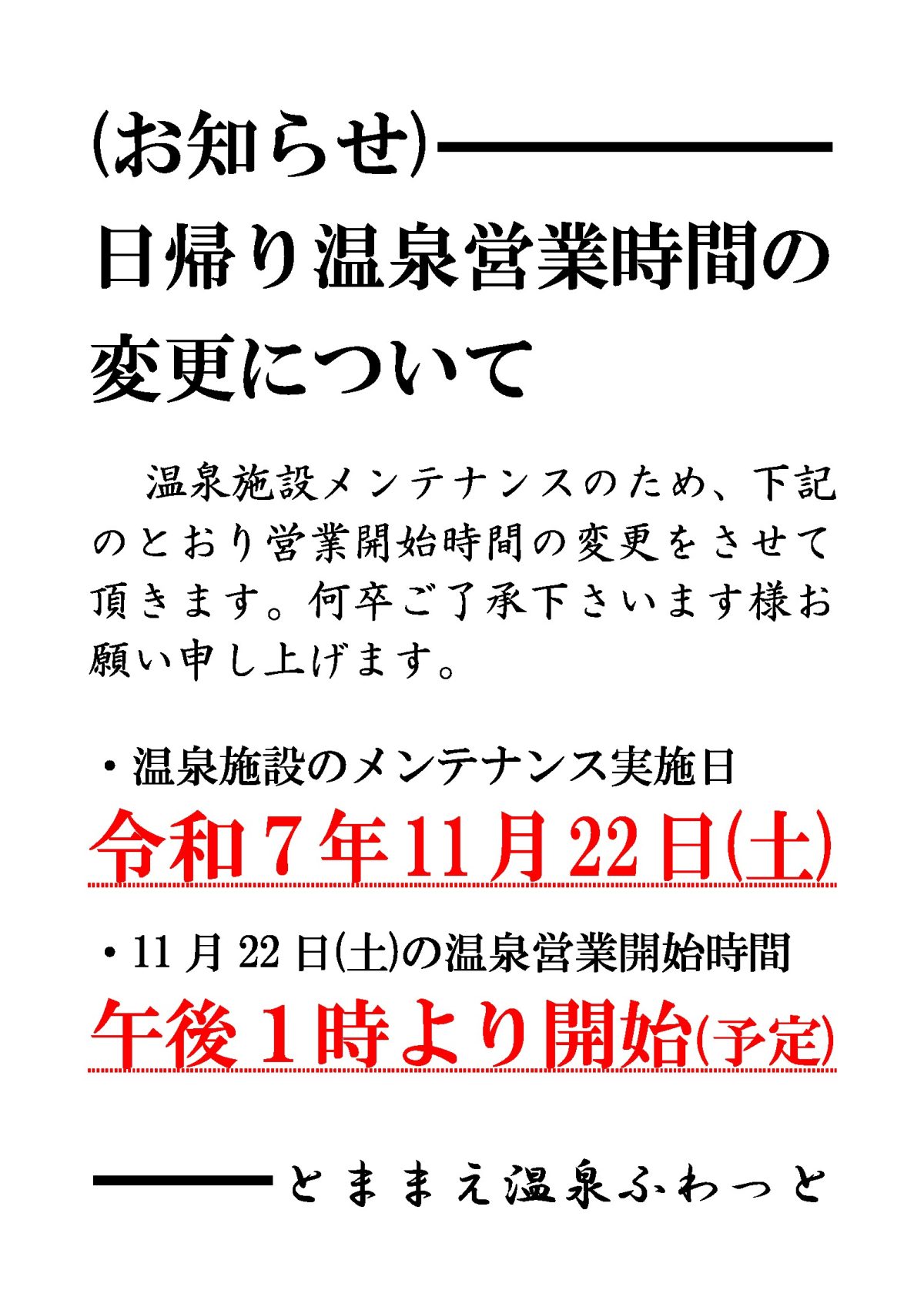 10月24日(金)・日帰り温泉営業時間の変更について 2025.10.23
