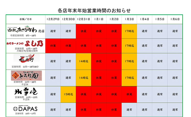 「道の駅あさひかわ」売店・フードコート年末年始営業日のお知らせ 2025.12.9
