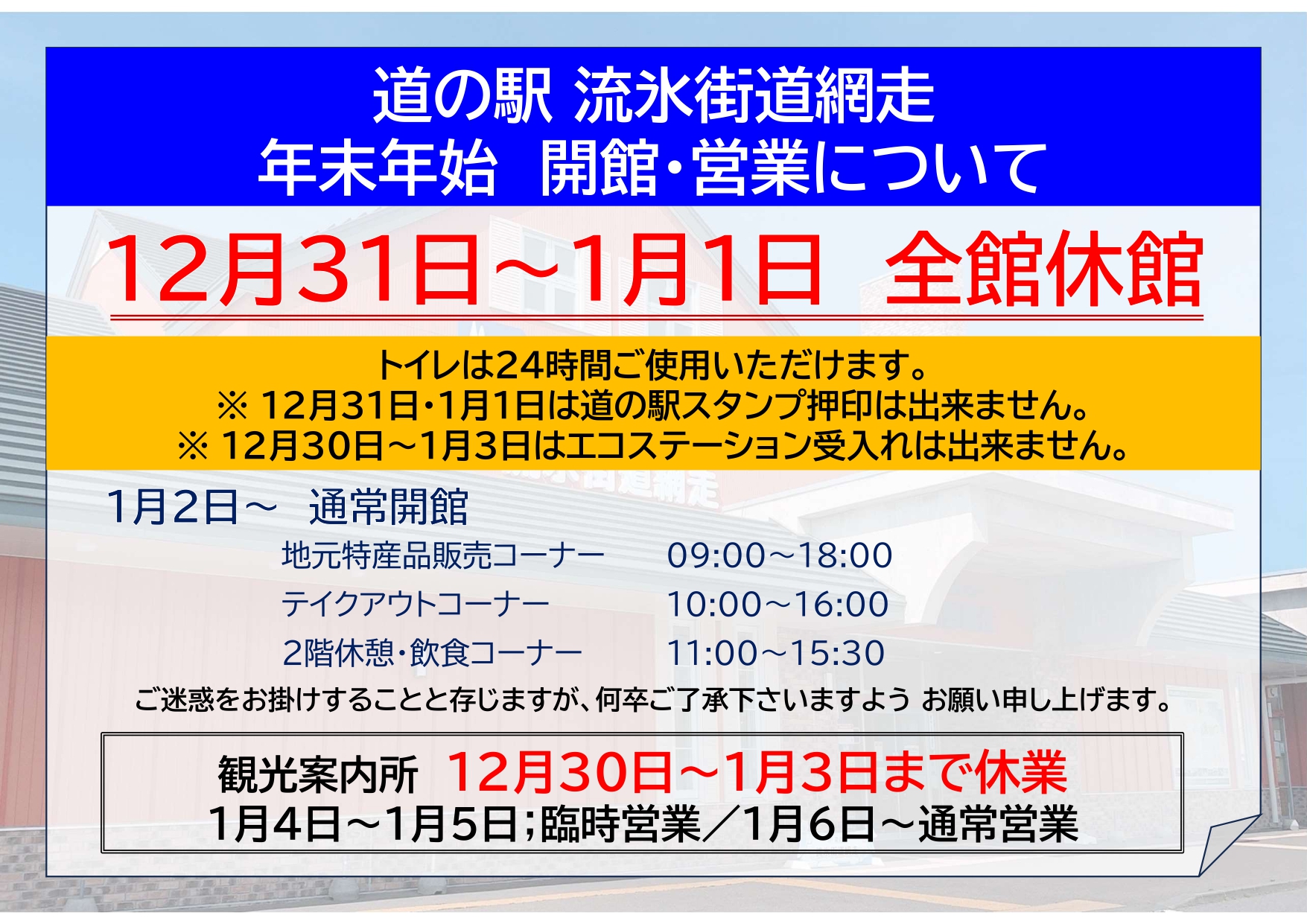 道の駅 流氷街道網走は、年末年始の営業について下記のとおりご案内いたします。