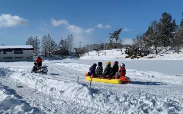 スノーモービルに引かれたバナナボートに乗り、雪の上を駆け抜けます。