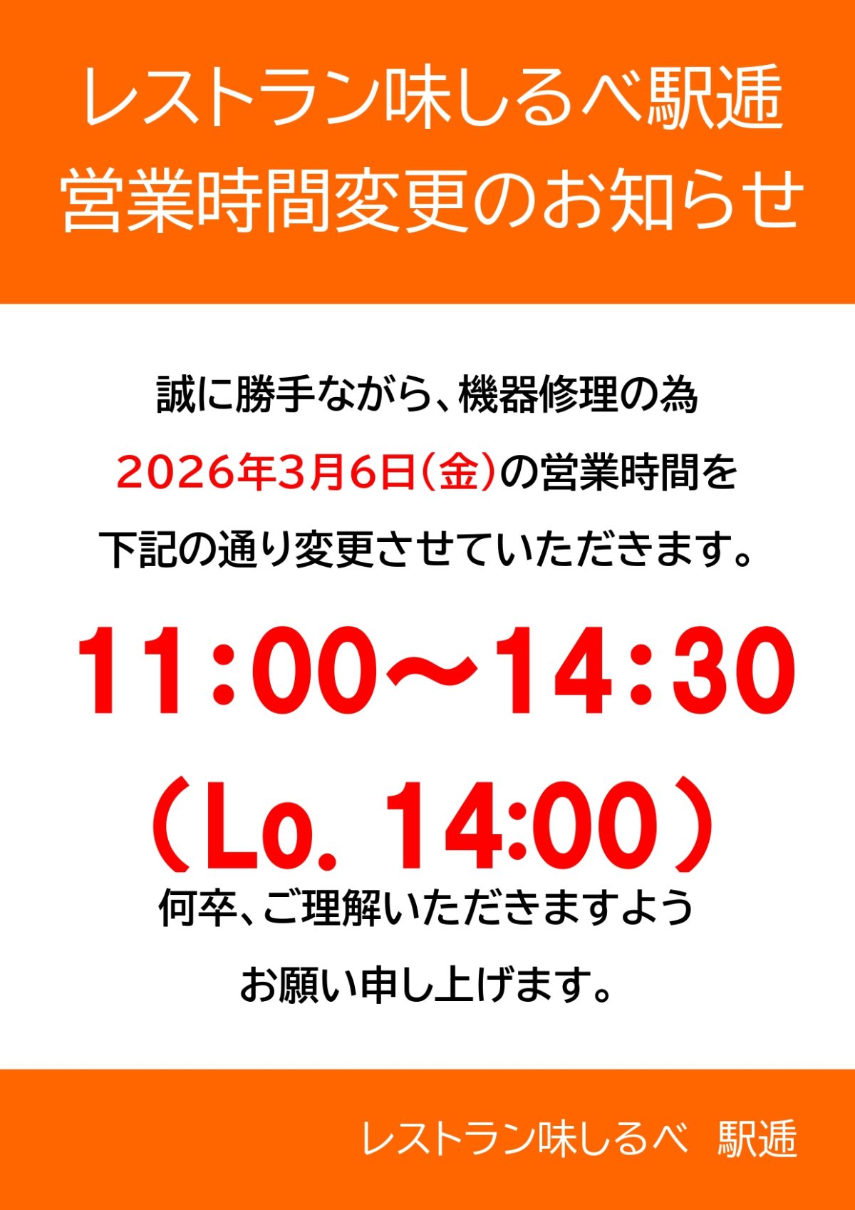 レストラン味しるべ 駅逓営業時間変更のお知らせ