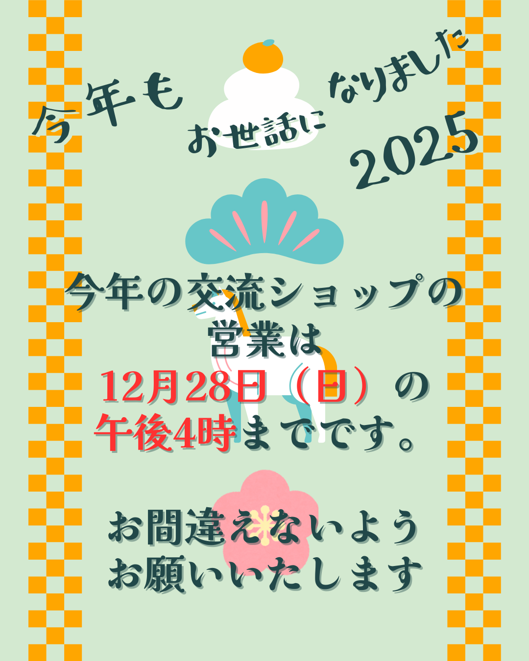 交流ショップの年内営業は、12月28日(日)の午後4時までです。