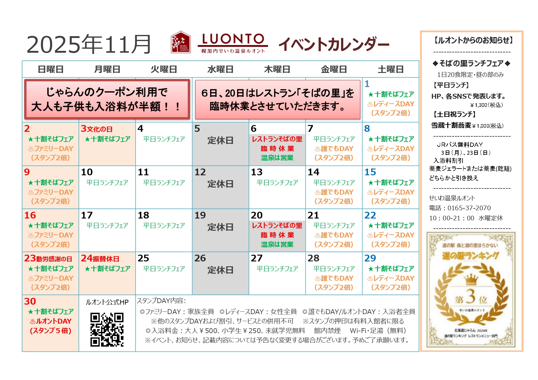 HOME > 各道の駅からのお知らせ > 森と湖の里ほろかないからのお知らせ > 11月のイベントカレンダー HOME > 各道の駅からのお知らせ > 森と湖の里ほろかないからのお知らせ > 11月のイベントカレンダー 森と湖の里ほろかないからのお知らせ 11月のイベントカレンダー 2025年11月5日 11月のイベントカレンダー 印刷する森と湖の里ほろかないの詳細はこちら森と湖の里ほろかないの詳細はこちら