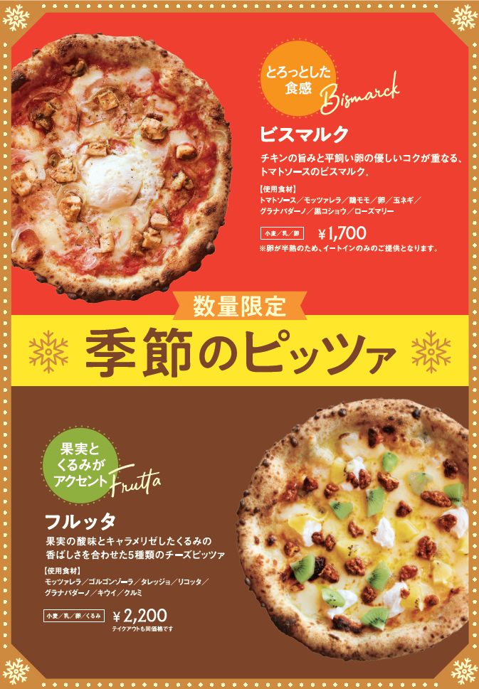 センターハウス2階のピッツェリア トニーノでは、チキンの旨みと平飼い卵の優しいコクが重なる「ビスマルク」と、果実の酸味とくるみがアクセントのチーズピッツァ「フルッタ」を3月末まで提供中!