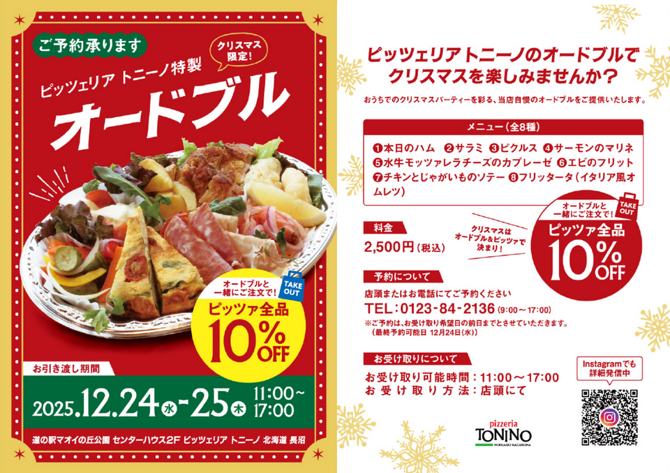 ピッツェリア トニーノ 北海道 長沼では、パーティーを彩るオードブルをクリスマス限定でご用意!