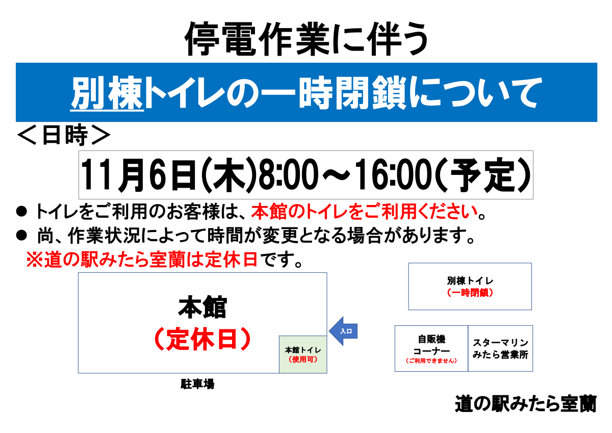 HOME > 各道の駅からのお知らせ > みたら室蘭からのお知らせ > 電気設備の点検作業に伴う全館停電について