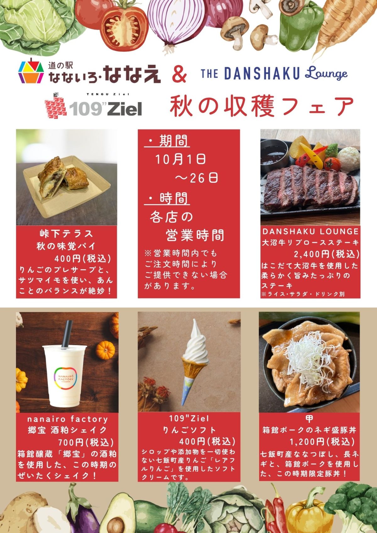 『道の駅なないろ・ななえ』『THE DANSHAKU Lounge』『109”Ziel』の3店では、10月1日(水)~26日(日)の期間限定で、七飯町で収穫された食材を使用した限定メニューを販売する『秋の収穫フェア🍂』を開催いたします!