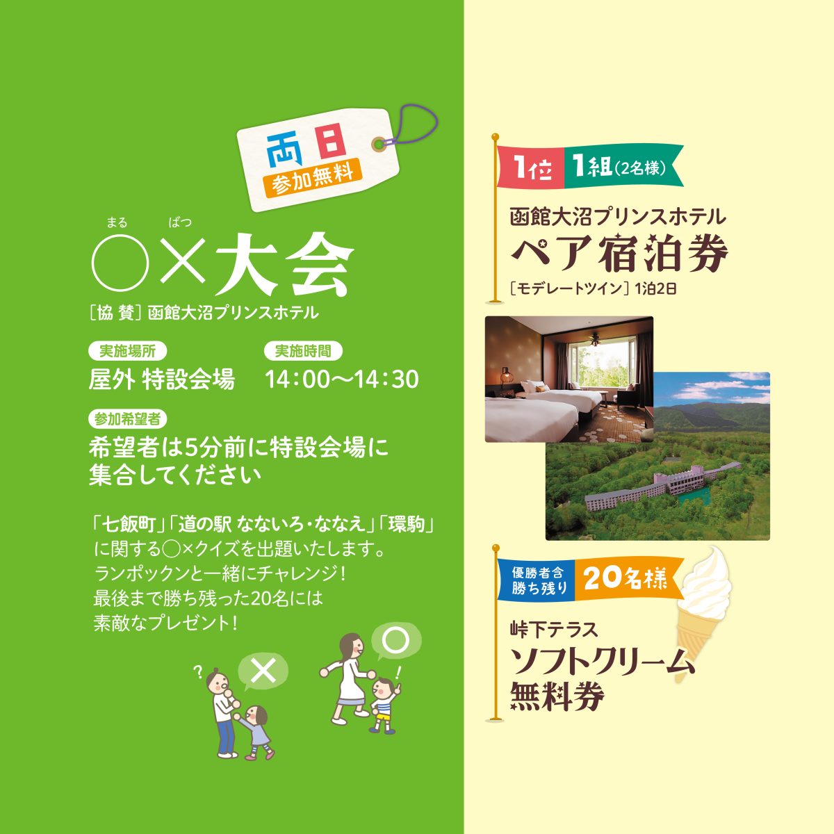 「七飯町」「道の駅なないろ・ななえ」「環駒」に関するクイズを出題!勝ち残った方には「函館大沼プリンスホテル ペア宿泊券」などが贈られます!参加希望の方は5分前に屋外特設会場に集合してください。