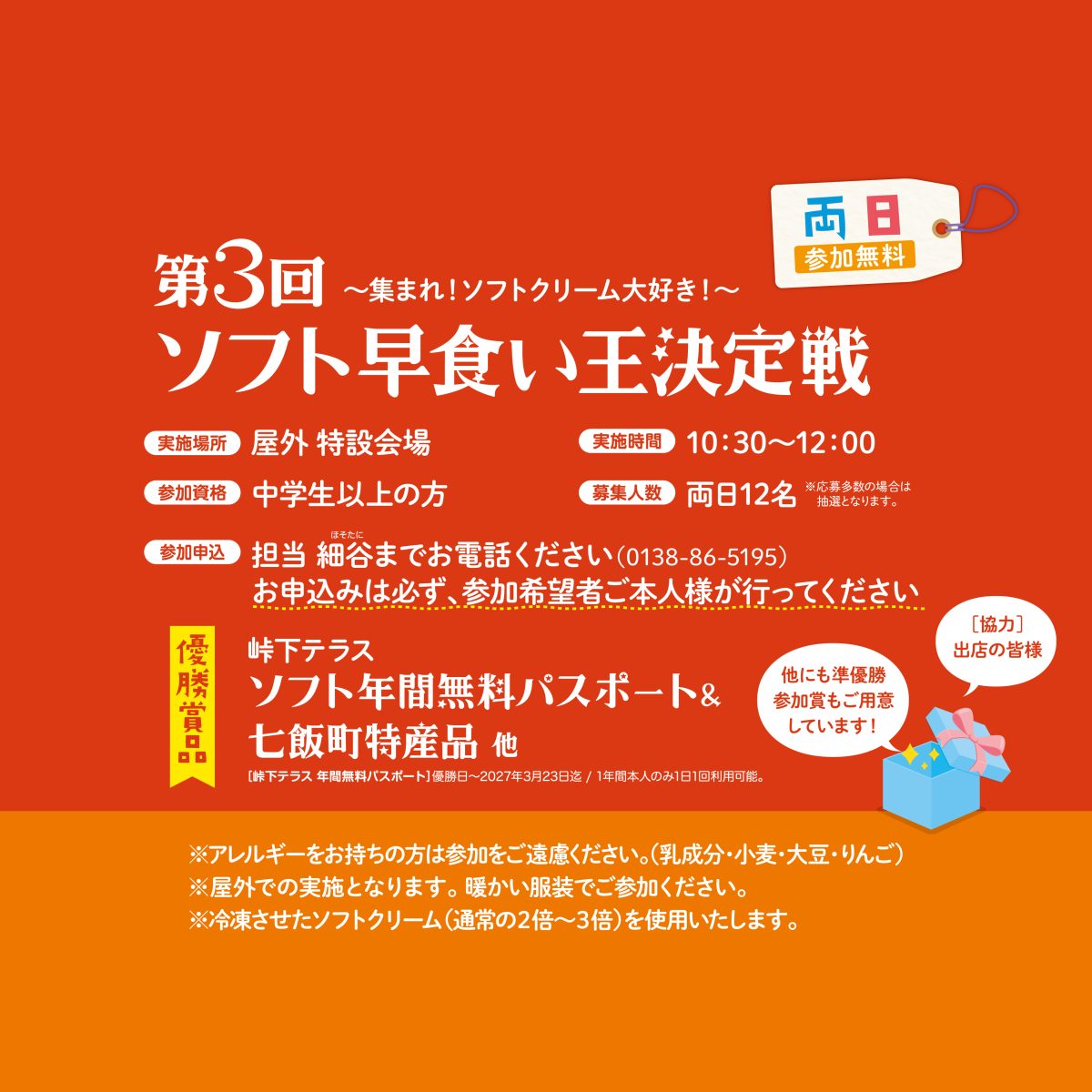 峠下テラスで人気のソフトクリームを特大サイズでご提供!ぜひチャレンジしてみてくださいね!優勝者には峠下テラスソフト年間無料パスポートや七飯町特産品などが贈られます!