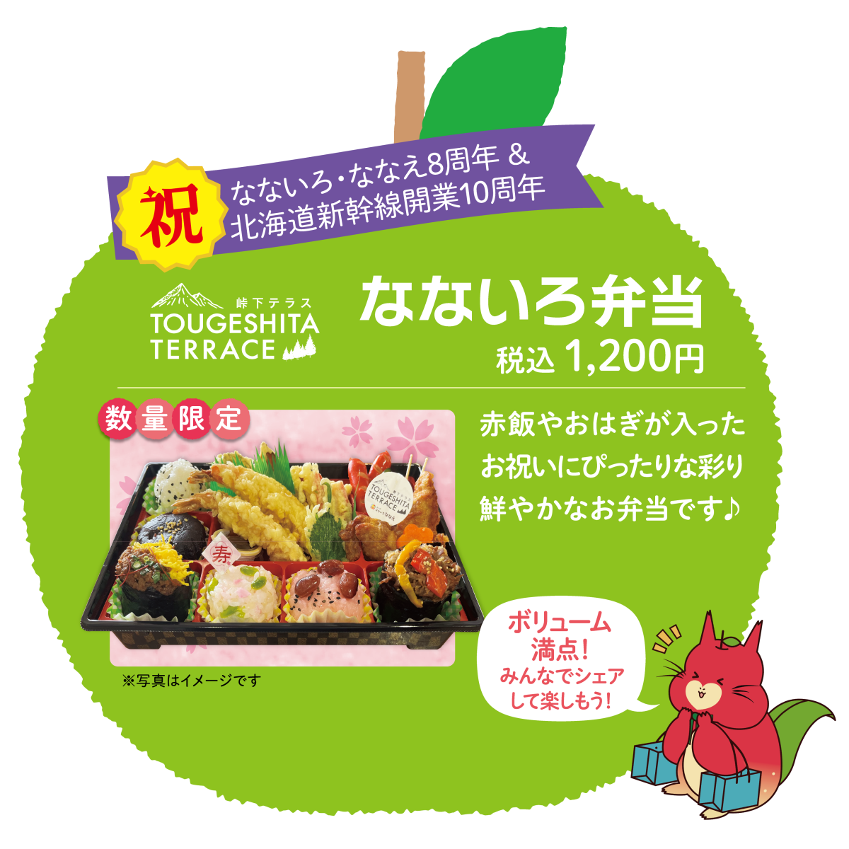 「峠下テラス」では、道の駅8周年と北海道新幹線開業10周年を記念して、お赤飯などが入った彩り鮮やかな「なないろ弁当」を1200円で販売