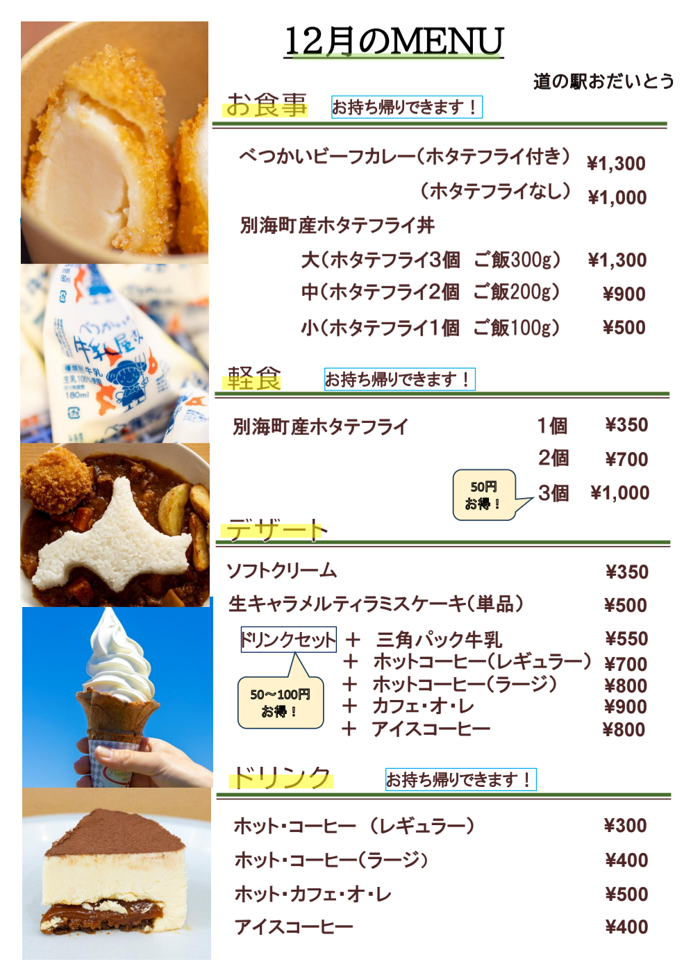 HOME > 各道の駅からのお知らせ > おだいとうからのお知らせ > 【別海町】12月のレストランメニューのお知らせ