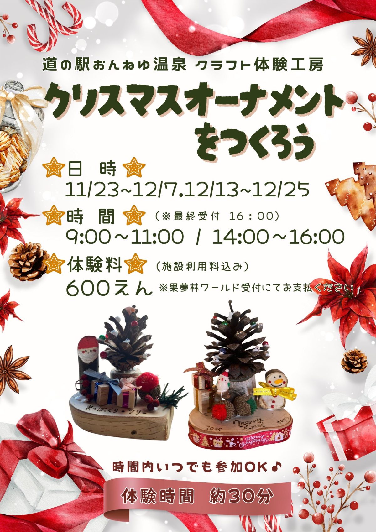 HOME > 各道の駅からのお知らせ > おんねゆ温泉からのお知らせ > 2025クリスマスイベント開催 果夢林の館編 HOME > 各道の駅からのお知らせ > おんねゆ温泉からのお知らせ > 2025クリスマスイベント開催 果夢林の館編 おんねゆ温泉からのお知らせ 2025クリスマスイベント開催 果夢林の館編 2025年11月22日 2025クリスマスイベント開催 11/23~12/7、12/12~12/25 今年もクラフト体験工房で ワークショップ 「クリスマスオーナメントを作ろう」を開催!! 楽しいクリスマスの思い出に 印刷するおんねゆ温泉の詳細はこちらおんねゆ温泉の詳細はこちら