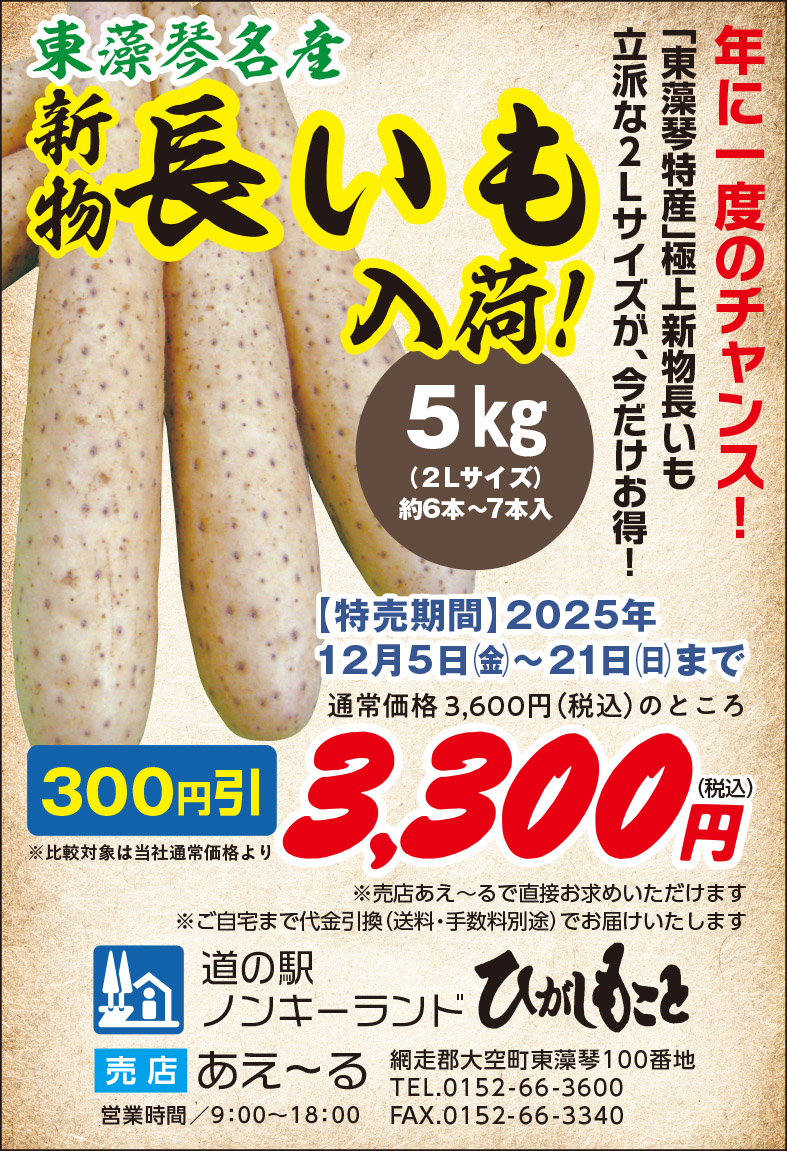 東藻琴名産の 新物長いも がいよいよ予約スタート 2025.11.18