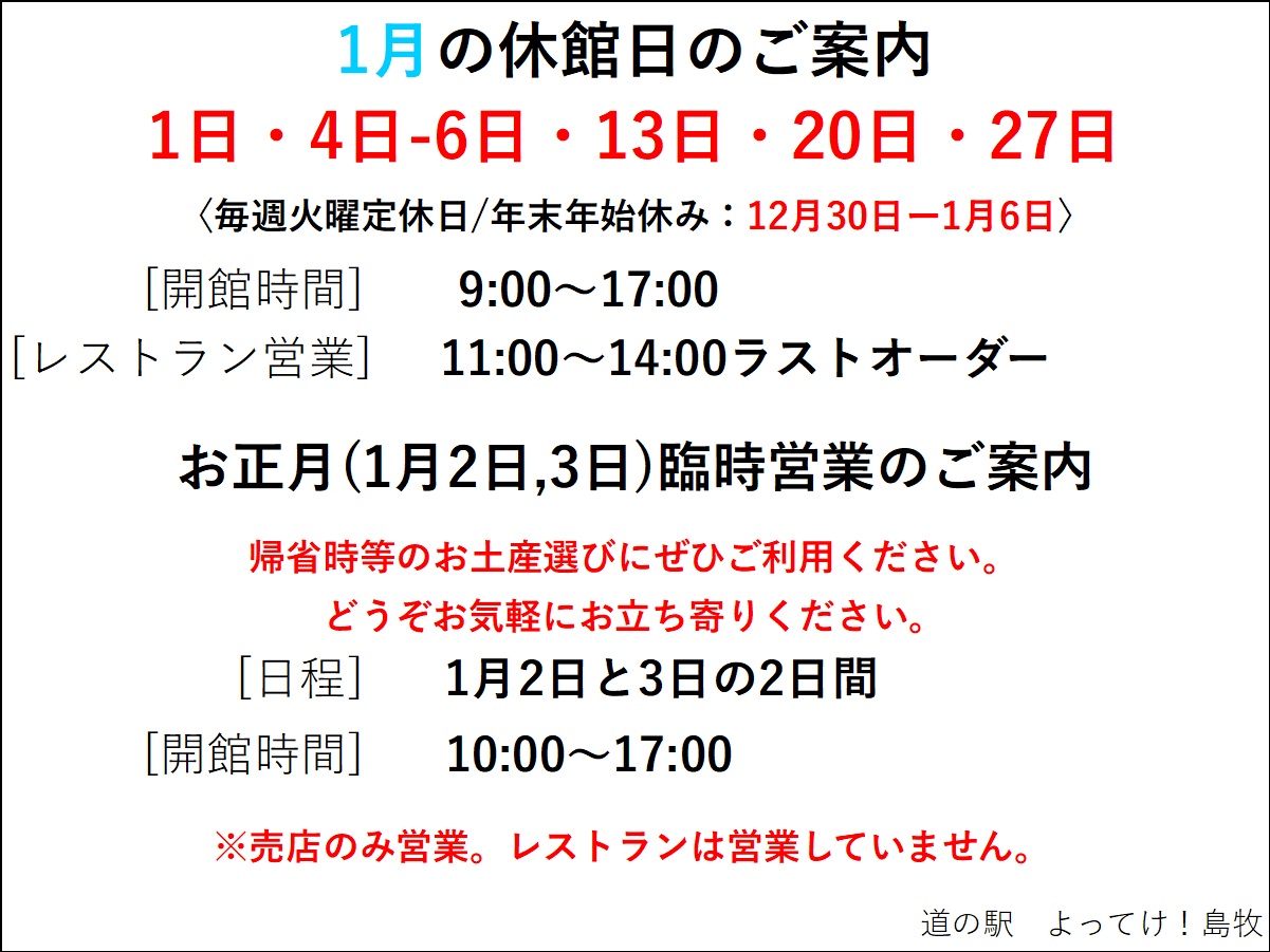 HOME > 各道の駅からのお知らせ > よってけ!島牧からのお知らせ > 【よってけ!島牧】お正月(2日・3日)の臨時営業と1月休館日のお知らせ HOME > 各道の駅からのお知らせ > よってけ!島牧からのお知らせ > 【よってけ!島牧】お正月(2日・3日)の臨時営業と1月休館日のお知らせ よってけ!島牧からのお知らせ 【よってけ!島牧】お正月(2日・3日)の臨時営業と1月休館日のお知らせ 2025年12月26日 お正月(1月2日と3日)、臨時営業としております。お土産選びにぜひご利用ください。 ※売店のみ営業。レストランは営業しておりません。 印刷するよってけ!島牧の詳細はこちらよってけ!島牧の詳細はこちら
