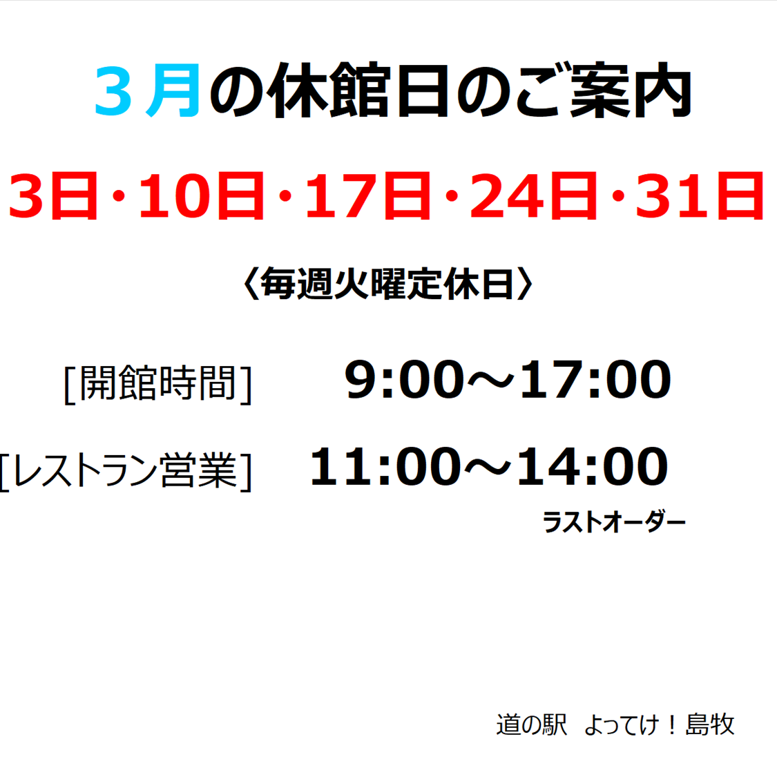 HOME > 各道の駅からのお知らせ > よってけ!島牧からのお知らせ > 【よってけ!島牧】3月休館日のお知らせ HOME > 各道の駅からのお知らせ > よってけ!島牧からのお知らせ > 【よってけ!島牧】3月休館日のお知らせ よってけ!島牧からのお知らせ 【よってけ!島牧】3月休館日のお知らせ 2026年2月26日 印刷するよってけ!島牧の詳細はこちらよってけ!島牧の詳細はこちら