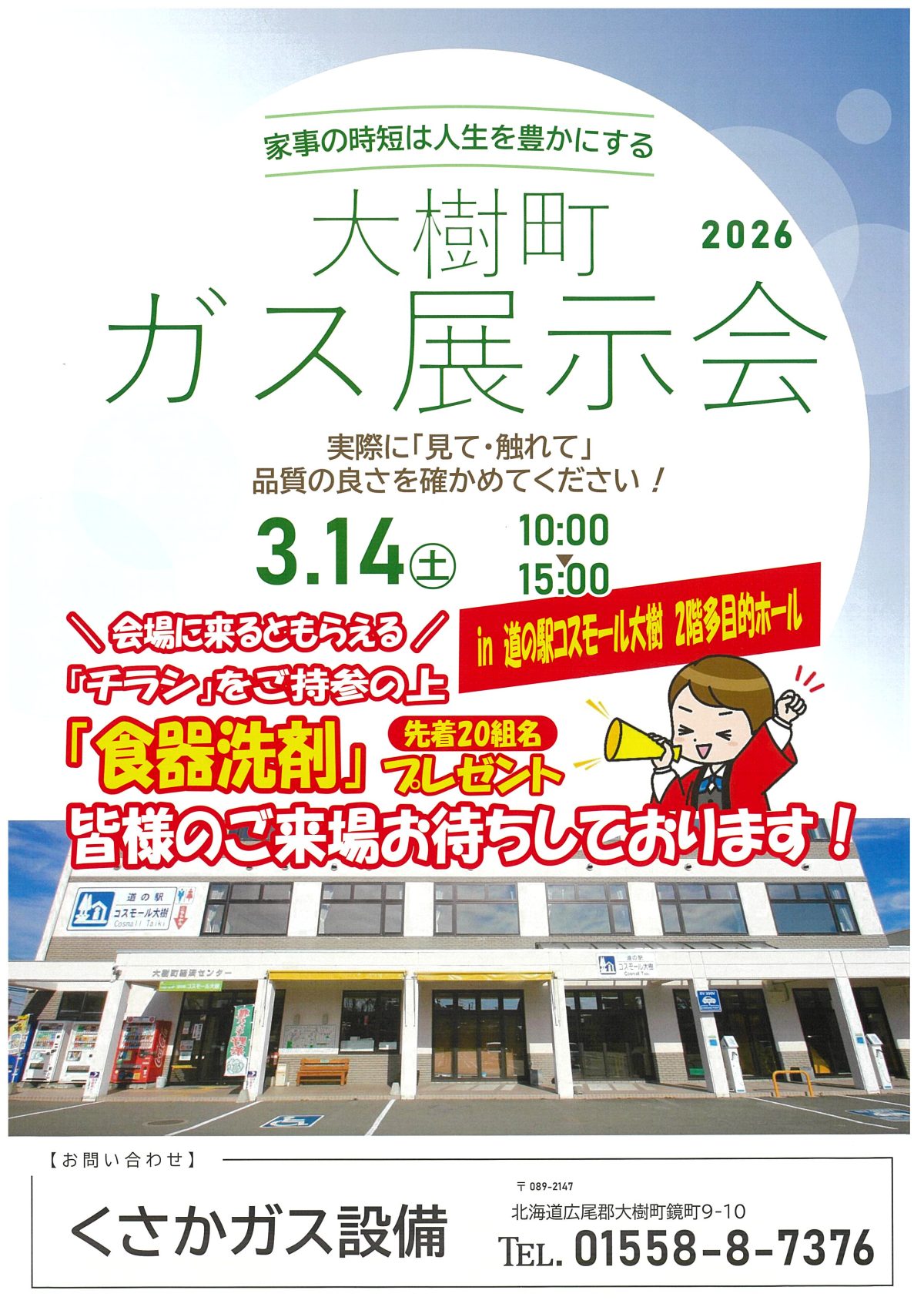 2026年3月14日(土)、大樹町経済センター(道の駅コスモール大樹)2階多目的ホールを会場に家事の時短は人生を豊かにする”大樹町ガス展示会2026″が開催されます。