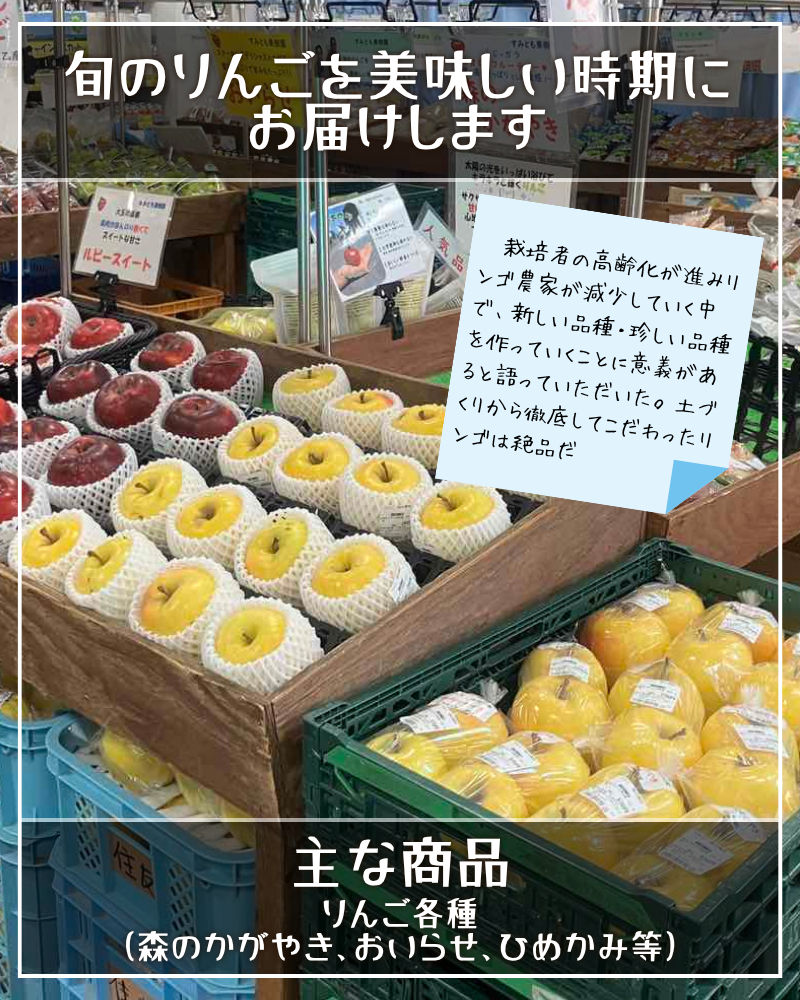 取材にご対応いただきました10月27日にはひめかみ・おいらせ・ルビースイート・森のかがやき🍎🍏といった品種が並んでいました。