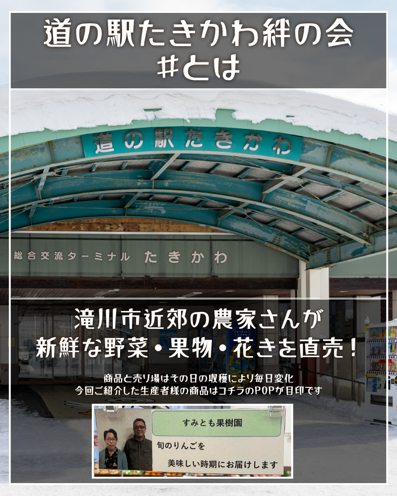 すみとも果樹園さんのリンゴは直販を行っておりません。お買い求めの際は、是非道の駅たきかわまでお越しいただければ幸いです。