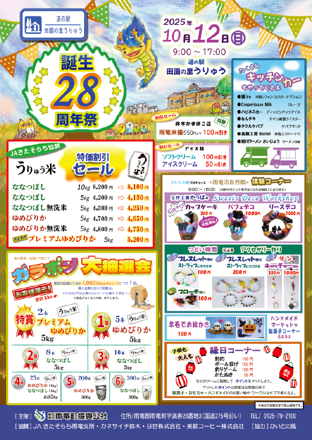 HOME > 各道の駅からのお知らせ > 田園の里うりゅうからのお知らせ HOME > 各道の駅からのお知らせ > 田園の里うりゅうからのお知らせ 田園の里うりゅうからのお知らせ 田園の里うりゅうからのお知らせ 田園の里うりゅうからのお知らせ 『誕生28周年祭』開催のお知らせ 2025.10.7 田園の里うりゅうからのお知らせ 田園の里うりゅうからのお知らせ 令和7年産 うりゅう米 販売予約開始のご案内 2025.9.20 田園の里うりゅうからのお知らせ 田園の里うりゅうからのお知らせ 「秋の大収穫感謝祭 新米祭り2025」のご案内 2025.9.19 田園の里うりゅうからのお知らせ 田園の里うりゅうからのお知らせ 令和7年産新米が当たるチャンス! 2025.9.5 田園の里うりゅうからのお知らせ 田園の里うりゅうからのお知らせ おいしい!初夏んまつり2025開催のお知らせ 2025.6.26 田園の里うりゅうからのお知らせ 田園の里うりゅうからのお知らせ 🍙うりゅう米ななつぼしで作る「おにぎり」販売スタート! 2025.5.7 田園の里うりゅうからのお知らせ 田園の里うりゅうからのお知らせ 鈴木かまぼこ店 臨時休業のお知らせ 2025.2.28 田園の里うりゅうからのお知らせ 田園の里うりゅうからのお知らせ 3月1日~あいす館OPENのお知らせ 2025.2.25 田園の里うりゅうからのお知らせ 田園の里うりゅうからのお知らせ 3月1日~営業時間変更のお知らせ 2025.2.25 田園の里うりゅうからのお知らせ 田園の里うりゅうからのお知らせ 令和6年産 うりゅう米 ゆめぴりか 完売のお知らせ 2025.2.7 田園の里うりゅうからのお知らせ 田園の里うりゅうからのお知らせ Harvest Fest開催について 2024.10.28 田園の里うりゅうからのお知らせ 田園の里うりゅうからのお知らせ 誕生27周年祭開催について 2024.10.10 田園の里うりゅうからのお知らせ 田園の里うりゅうからのお知らせ 秋の収穫大感謝祭・新米祭り2024開催のお知らせ 2024.9.11 田園の里うりゅうからのお知らせ 田園の里うりゅうからのお知らせ おいしい初夏んまつり2024を開催します! 2024.6.15 田園の里うりゅうからのお知らせ 田園の里うりゅうからのお知らせ おにぎりの販売を開始しました! 2024.4.24 田園の里うりゅうからのお知らせ 田園の里うりゅうからのお知らせ 【テナント募集】レストランの営業される方を募集しています。 2023.11.9 田園の里うりゅうからのお知らせ 田園の里うりゅうからのお知らせ 鈴木かまぼこ店 臨時休業のお知らせ 2023.8.30 田園の里うりゅうからのお知らせ 田園の里うりゅうからのお知らせ レストラン「穂」閉店のお知らせ 2023.8.16 田園の里うりゅうからのお知らせ 田園の里うりゅうからのお知らせ 田園の里うりゅう あいす館 臨時休業のお知らせ 2023.8.3 田園の里うりゅうからのお知らせ 田園の里うりゅうからのお知らせ 節電営業のお知らせ 2023.3.6 田園の里うりゅうからのお知らせ 田園の里うりゅうからのお知らせ 【あいす館】アイスクリーム販売再開のお知らせ 2023.2.26 田園の里うりゅうからのお知らせ 田園の里うりゅうからのお知らせ 【数量限定】純米吟醸うりゅう“生原酒”が入荷しました! 2023.1.19 田園の里うりゅうからのお知らせ 田園の里うりゅうからのお知らせ Happy Halloween 2022開催のお知らせ 2022.10.14 田園の里うりゅうからのお知らせ 田園の里うりゅうからのお知らせ 【重要】秋の大収穫感謝祭新米祭り2022 サンマ販売中止のお知らせ 2022.9.23 田園の里うりゅうからのお知らせ 田園の里うりゅうからのお知らせ 秋の大収穫感謝祭 新米祭り2022開催のお知らせ 2022.9.11 田園の里うりゅうからのお知らせ 田園の里うりゅうからのお知らせ 【雨竜&北竜】第27回 道の駅お買い物ラリー開催のお知らせ 2022.9.4 田園の里うりゅうからのお知らせ 田園の里うりゅうからのお知らせ ★10/31 ハロウィンイベント開催のお知らせ★ 2021.10.24 田園の里うりゅうからのお知らせ 田園の里うりゅうからのお知らせ 令和3年産うりゅう米の販売がはじまりました! 2021.9.25 田園の里うりゅうからのお知らせ 田園の里うりゅうからのお知らせ 緊急事態宣言における営業時間の短縮について 2021.8.26 田園の里うりゅうからのお知らせ 田園の里うりゅうからのお知らせ 「田園の里うりゅう 海産物フェア2021」の開催について 2021.7.7 田園の里うりゅうからのお知らせ 田園の里うりゅうからのお知らせ 5月9日はアイスクリームの日 2021.5.8 田園の里うりゅうからのお知らせ 田園の里うりゅうからのお知らせ 道内初“お米のUFOキャッチャー”が新登場 2021.4.11 田園の里うりゅうからのお知らせ 田園の里うりゅうからのお知らせ 休業のお知らせ 2021.3.3 田園の里うりゅうからのお知らせ 田園の里うりゅうからのお知らせ 年末年始の営業について 2020.12.7 田園の里うりゅうからのお知らせ 田園の里うりゅうからのお知らせ 営業時間の変更について【6月1日より】 2020.5.28 田園の里うりゅうからのお知らせ 田園の里うりゅうからのお知らせ 臨時休業のお知らせ 2020.4.27 田園の里うりゅうからのお知らせ 田園の里うりゅうからのお知らせ 施設一部の臨時休館につい