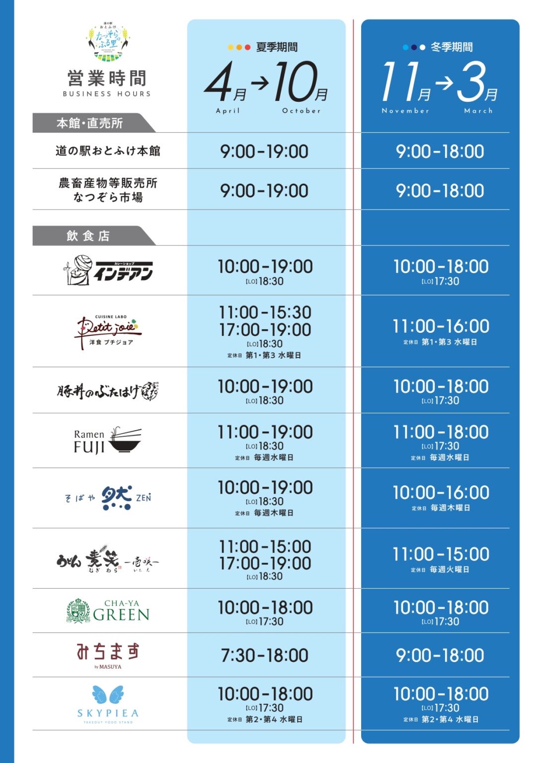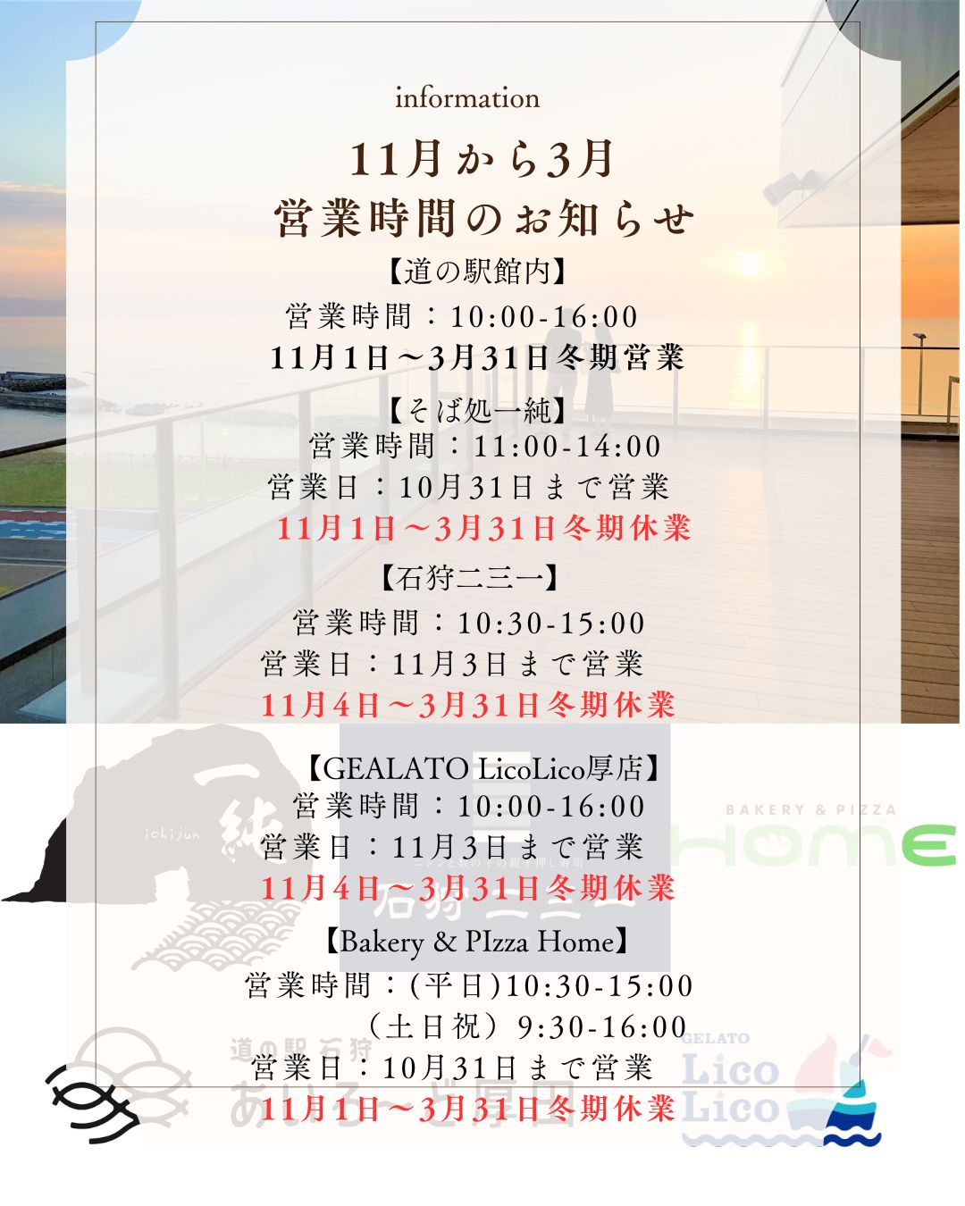 【11月~3月】道の駅及び飲食店各営業時間変更について 2025.10.21