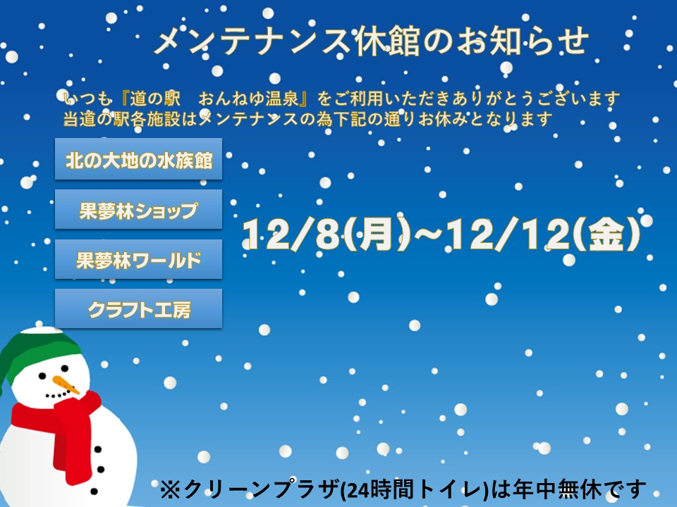 HOME > 営業時間・休館情報 > メンテナンス休館のお知らせ HOME > 営業時間・休館情報 > メンテナンス休館のお知らせ 営業時間・休館情報 メンテナンス休館のお知らせ 2025年12月5日 いつも『道の駅おんねゆ温泉』をご利用いただきありがとうございます 下記の期間メンテナンスの為、休館致します ――記―― 12月8日(月)~12月12日(金) 印刷するおんねゆ温泉の詳細はこちらおんねゆ温泉の詳細はこちら