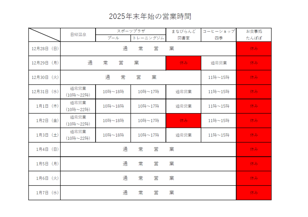 HOME > 営業時間・休館情報 > 【むかわ四季の館】年末年始営業時間のお知らせ HOME > 営業時間・休館情報 > 【むかわ四季の館】年末年始営業時間のお知らせ 営業時間・休館情報 【むかわ四季の館】年末年始営業時間のお知らせ 2025年12月7日 印刷するむかわ四季の館の詳細はこちらむかわ四季の館の詳細はこちら
