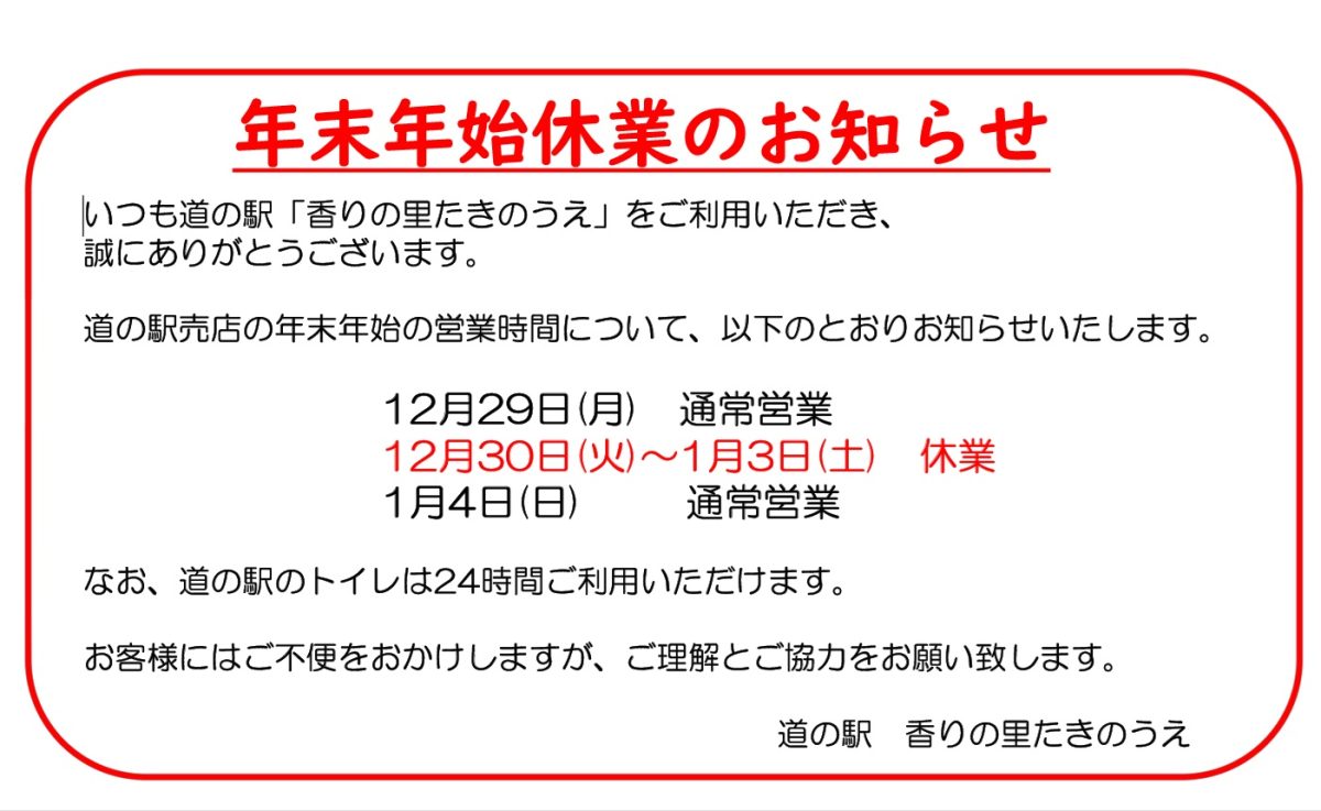 HOME > 各道の駅からのお知らせ > 香りの里たきのうえからのお知らせ > 【香りの里たきのうえ】年末年始休業のお知らせ