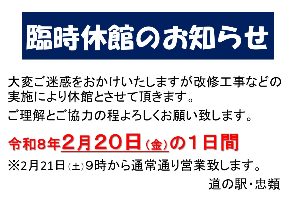 HOME > 営業時間・休館情報 > 「道の駅・忠類」臨時休館日のお知らせ(2月20日)1日間 HOME > 営業時間・休館情報 > 「道の駅・忠類」臨時休館日のお知らせ(2月20日)1日間 営業時間・休館情報 「道の駅・忠類」臨時休館日のお知らせ(2月20日)1日間 2026年2月16日 この度、2月20日(金)の1日間、改修工事などにより休館とさせて頂きます。 また、営業再開は2月21日(土)の9時からとなります。 大変ご迷惑をお掛け致しますが、ご理解とご協力の程よろしくお願い致します。 印刷する忠類の詳細はこちら忠類の詳細はこちら