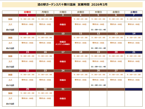 2026年3月 施設開館時間・SPA KOHAKU (コハク)の営業時間をお知らせ致します。