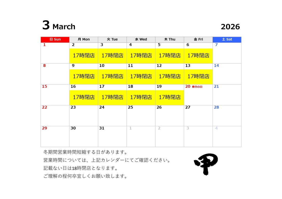 3月のテナント『甲』の営業時間をカレンダーのとおり変更いたします。ご不便をおかけしますが、ご理解の程よろしくお願いいたします。