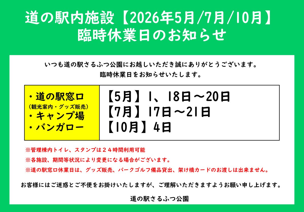 皆様、日頃より道の駅さるふつ公園をご利用いただき誠にありがとうございます。