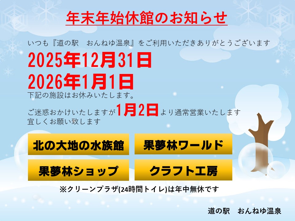 HOME > Onneyu Onsen HOME > Onneyu Onsen 道の駅を見る 年末年始休館のお知らせ 12月16日 臨時休業のお知らせ 12月15日 臨時休業のお知らせ メンテナンス休館のお知らせ おんねゆ温泉からのお知らせ 2025クリスマスイベント開催 北の大地の水族館編 おんねゆ温泉からのお知らせ ハロウィンオーナメントをつくろう!! おんねゆ温泉からのお知らせ ありがとう30周年 おんねゆ温泉からのお知らせ 8月2日~8月3日 「第73回おんねゆ温泉祭り」開催!! おんねゆ温泉からのお知らせ 8月3日はたらくくるまイベント開催!! おんねゆ温泉からのお知らせ 貝殻キャンドル作り体験 開催!! おんねゆ温泉からのお知らせ 今年もやります 「おくだなつみ」個展開催!! おんねゆ温泉からのお知らせ 「いただきますライブ」今年も始まります おんねゆ温泉からのお知らせ 5/11 北の大地の水族館 駐車場変更について おんねゆ温泉からのお知らせ 5/11 8年振り『むらさきつつじロードレース2025開催!!』 おんねゆ温泉からのお知らせ 4月26日~5月6日 特別展示 赤いイトウ 今年も開催 おんねゆ温泉からのお知らせ 4月19日~20日 来るっCOOK ハトが出ますよ おんねゆ温泉からのお知らせ 4月8日~4月14日 メンテナンス休館のお知らせ 臨時休業(果夢林ショップ)のお知らせ おんねゆ温泉からのお知らせ 1月10日はイトウの日!! 1月9日~1月13日イベント開催 年末年始休館のお知らせ おんねゆ温泉からのお知らせ 冬休み企画 廃材クラフト おんねゆ温泉からのお知らせ 北の大地の水族館 クリスマスイベント おんねゆ温泉からのお知らせ クラフト体験工房 『まつぼっくりツリーをつくろう』 12月メンテナンス休館について 11月11日 営業時間変更のお知らせ おんねゆ温泉からのお知らせ 11月2日~11月4日 『第2回 冬眠前の腹ごしらえ』~地域の味覚が盛りだくさんな3日間~ おんねゆ温泉からのお知らせ 10/15(火)~11.15(金)おくだなつみ『きたみの妖精 タマネギツネと北海道の動物展』開催 おんねゆ温泉からのお知らせ 9月21日、22日「第1回あんぜんまなべるfes秋」 開催 おんねゆ温泉からのお知らせ 7月13日、14日はノンアルコールフェスへ おんねゆ温泉からのお知らせ 北の大地の水族館 リニューアル12th記念企画 おんねゆ温泉からのお知らせ イマジネーションを刺激する 「廃材クラフト」イベント開催 おんねゆ温泉からのお知らせ 今年も始まりました「いただきますライブ」 おんねゆ温泉からのお知らせ 飲酒運転根絶キャンペーン イベント おんねゆ温泉からのお知らせ 5/12「あつまれ はたらくくるま 第1弾~まもるくるま~」を開催いたします おんねゆ温泉からのお知らせ キュウリウオってなぁに?展 おんねゆ温泉からのお知らせ 世界最大級ハト時計 目覚めイベント メンテナンス休館のお知らせ 4月からの営業時間変更のお知らせ 荒天による臨時休館のお知らせ おんねゆ温泉からのお知らせ 年末年始休館のお知らせ 営業時間変更のご案内 クリーンプラザ(24時間トイレ)の使用中止のお知らせ おんねゆ温泉からのお知らせ 道の駅 おんねゆ温泉 北の大地の水族館 2023年6月6日より約3年ぶり『いただきますライブ』再開します 道の駅おんねゆ温泉 果夢林ワールド臨時営業時間変更のお知らせ